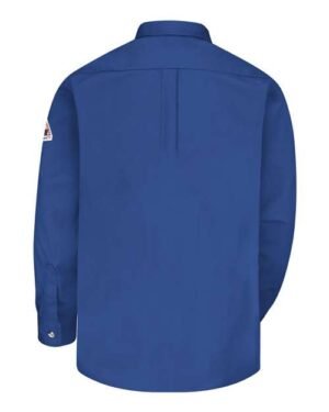 - Two chest pockets with button flap closures and sewn-in pencil stall