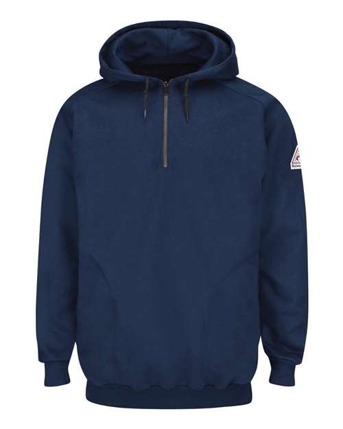 - Two ply hood with drawcord closure and 1/4 zip front