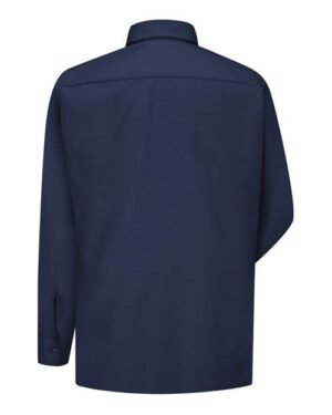- Two button-through flapped pockets with angled bartacks and sewn-down pencil stall on left pocket