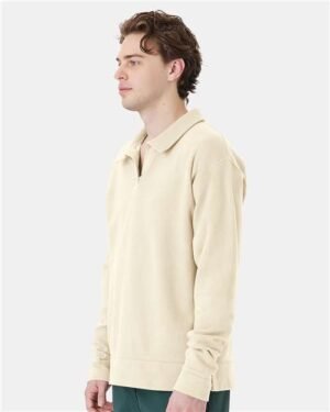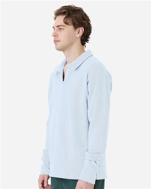 - Relaxed open neckline with twill placket and self-fabric collar
