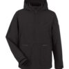 - Three-piece visored hood cinches tight to seal out sleet and wind